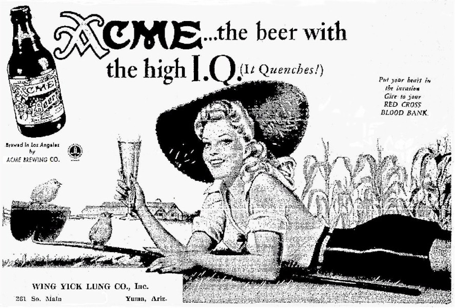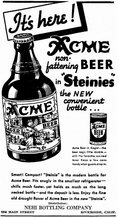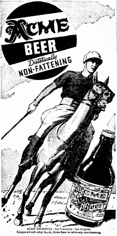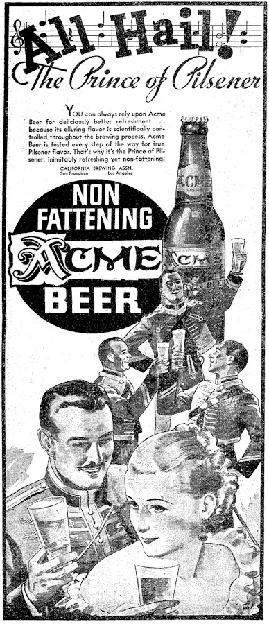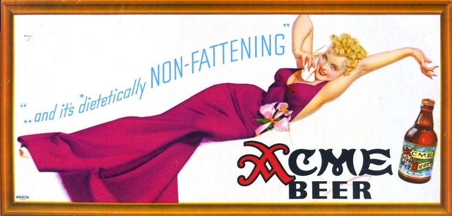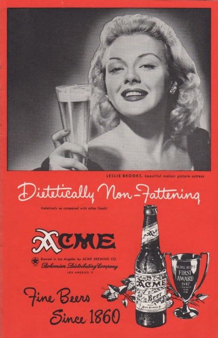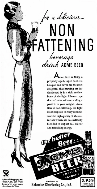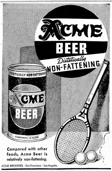 Brewing Co." in Los Angeles. This version also carried the notation: "Non-Fattening" in red, placed between "Acme" and "Beer". They were soon ordered to remove the claim from the label, but continued using it in their advertising. |