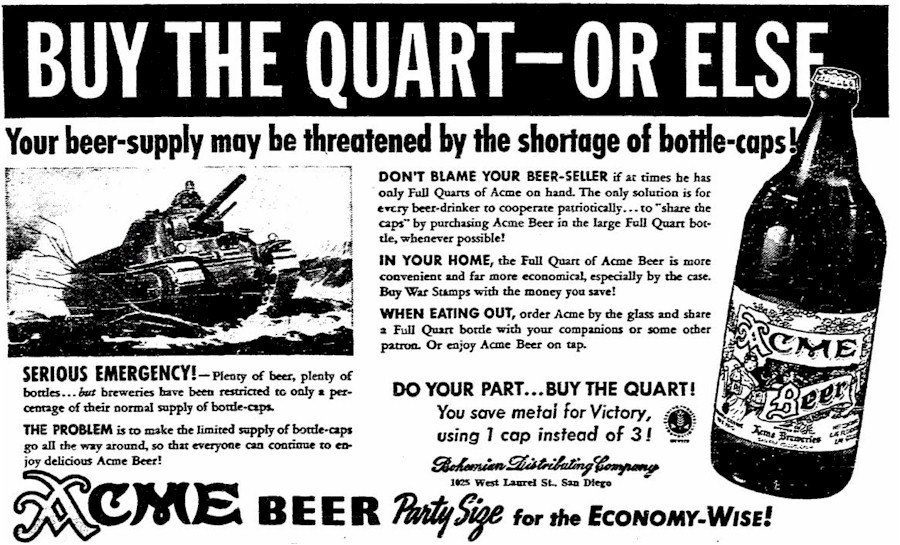 1946 to 1947 - The label's background figures, between the "Acme" and "Beer" banners, are now wearing contemporary clothing. Labels for the smaller size bottles didn't have any banners at the top like this quart size. |
