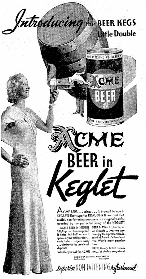 1935 to 1936 - The label at right, without the alcohol statement, was in use from August '35 until April 1936, when the "brewed by Cereal Products Refining Corp." was removed from the label (see above), and "Acme Breweries" replaced "California Brewing Assn." This was also for a 22 oz. bottle, a size that was available until June of '36. Acme's first canned beer was introduced in Jan. 1936, which was a more convient size to refrigerate and stack, which helped kill the 22 oz. bottle |