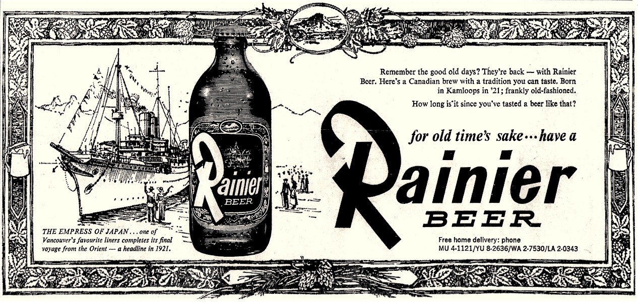 Nov. 29, 1923 – “An injunction restraining the Rainier Brewing Company of Canada, Ltd. from using their present trademark on beer labels is asked for in a writ issued on behalf of