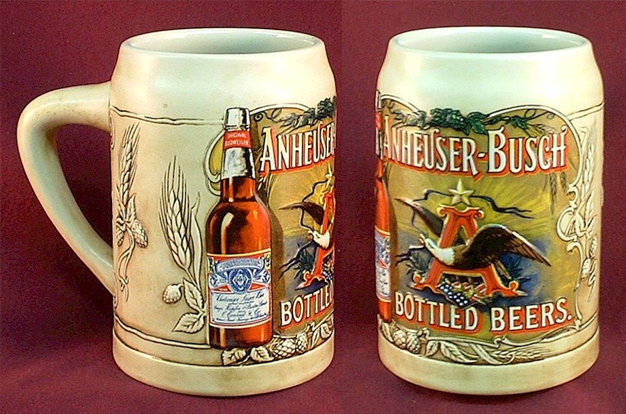 A-B logo is surrounded by high relief barley and hops. Stein measures