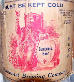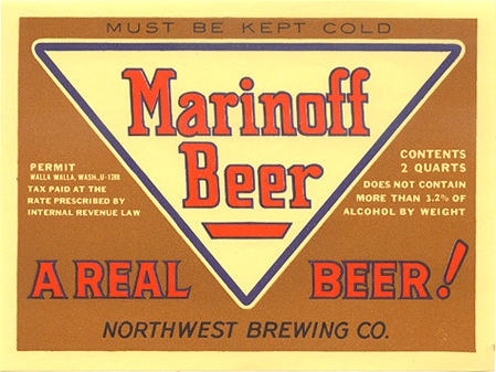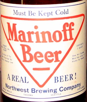 With Repeal in April '33, Marinoff was immediately up and running with the production of full strength "Olympic Club." However, the Olympia Brewing Co. of Tumwater was nearing completion of its new plant, and requested that Marinoff be enjoined from using the trade name "Olympic Club" and slogan "It's the Beer." On Oct. 31,1933, Olympia got their injunction. Within a week Marinoff appealed, but the appeal was denied. So "Olympic Club" lasted only six months as a real beer! With the purchase of the Gambrinus Brewery in Portland, Marinoff now owned the brand, and with "Olympic Club" gone, both "Gambrinus" and "Marinoff" (labels below) became his primary brands. However, his troubles were not over. A labor dispute with the Teamster's Union in Sept. of '34, resulted in picketing of his plants, boycotts of his beer, and violence against his workers and clients. Consequently, he suffered a major down-turn in business. On January 18, 1935, Marinoff re-organized his eastern plant as the Northwest Brewing Co. of Walla Walla, Inc., and the following month he transferred the registered office of the Northwest Brewing Co. (Tacoma) to the Walla Walla plant. But the Union problems persisted, culminating in a shooting death of a Teamster in Tacoma. Peter Marinoff was convicted of conspiracy but the conviction was subsequently overturned. However, the Teamsters were furious at this perceived injustice and vowed to "get" Marinoff. Fearing for his own safety and that of his family, he fled to California. By mid-1935 the two plants were shut down and forced into bankruptcy.