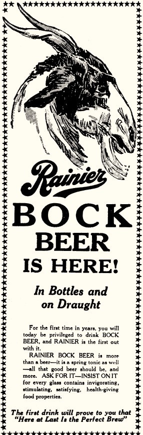 Each spring it's traditional for breweries to offer a Bock beer, and Rainier was the first to release its own version. The January 1934 ad for Rainier Bock is shown here (left), and the first Bock label used by Rainier is shown above.