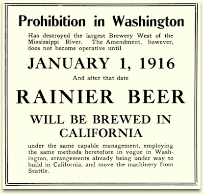 In 1910 women had been granted the right to vote, and the Woman's Christian Temperance Union was still at work. So it's no surprise that on November 3, 1914, Washington State citizens voted to prohibit the manufacture and sale of alcohol, including beer. Brewers were forced to wind down their production, and had one year to deplete their inventories, and dismantle their operations.