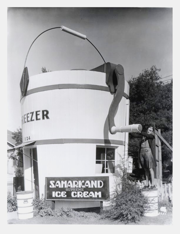 In 1923, JP moved into the production of another food product with the establishment of the Samarkand Ice Cream Company (photo). His head office was at 893 Folsom St., San Francisco, and he built an additional plant in Los Angeles. The ice cream was marketed throughout the State, and here's a photo of an outlet in South Pasadena. These folk art, or roadside attractions, were popular in the 20s and 30s.